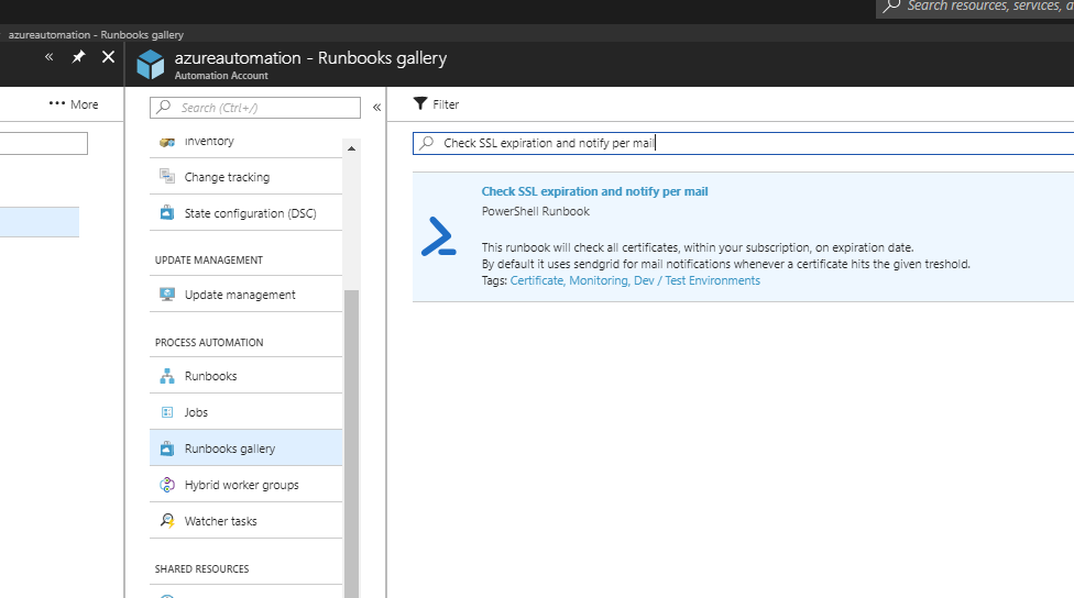 Step 1 Install the runbook using the Azure Automation Runbooks gallery. Search for “Check SSL expiration and notify per mail”.